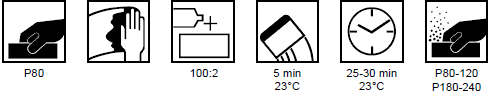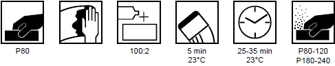 Filling putty for sealing medium sized bumps. Designed for common surfaces including iron, aluminum, zinc and fiberglass. Well sandable, finely applicable, without pores, also applicable to equalize roughness on wood (harder species), fiberglass, concrete, etc.